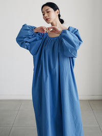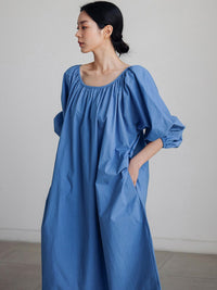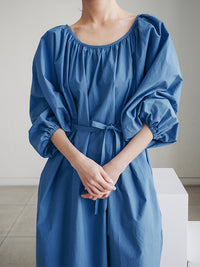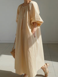 Original Casual Loose Solid Color Pleated Puff Sleeves Midi Dress