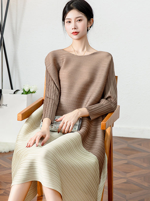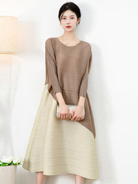 Original Contrast Color Split-Joint Round-Neck Pleated Midi Dress
