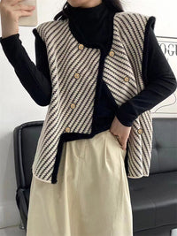 Original Creation Sleeveless Loose Buttoned Striped Round-Neck Vest Outerwear