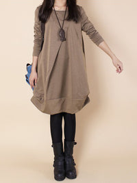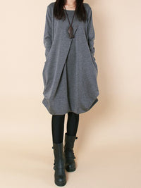 Original Loose Pleated 4 Colors Round-Neck Long Sleeves Short Dress