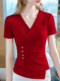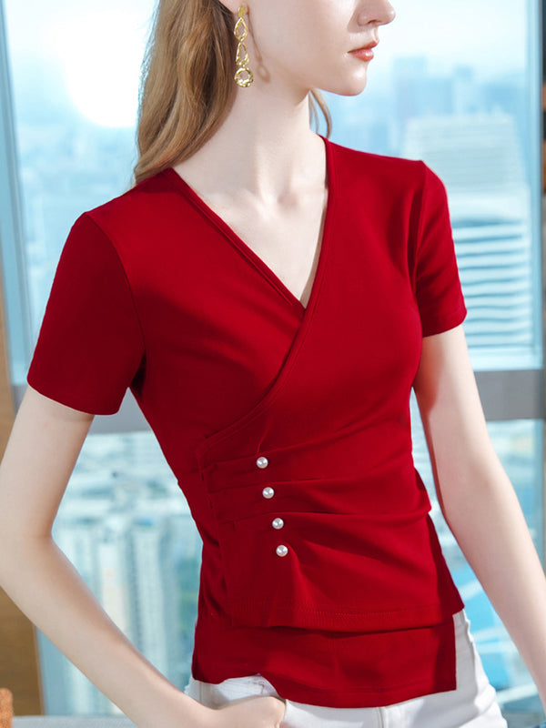 Original Skinny Solid Color Pleated Asymmetric Beaded T-Shirt Top
