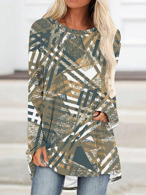 Plaid Printed High-low Long Sleeves Round-neck T-Shirts Tops