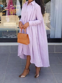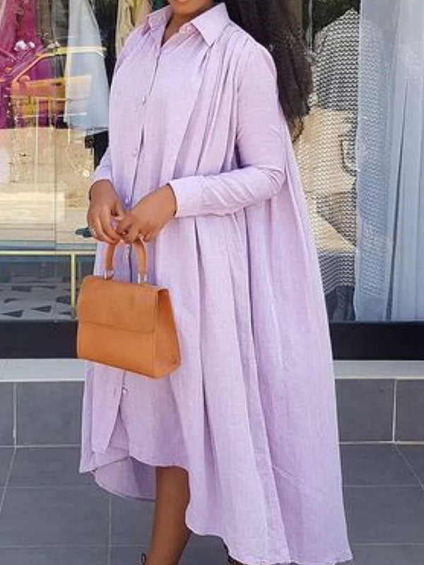 Pleated Solid Color High-Low Long Sleeves Lapel Shirt Dress Maxi Dresses