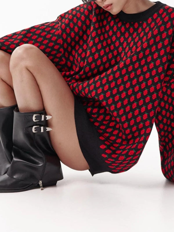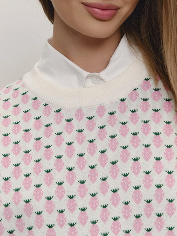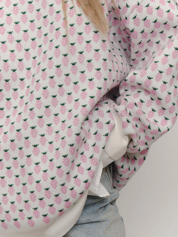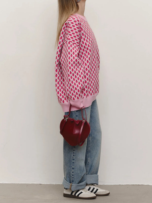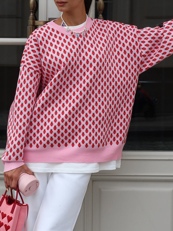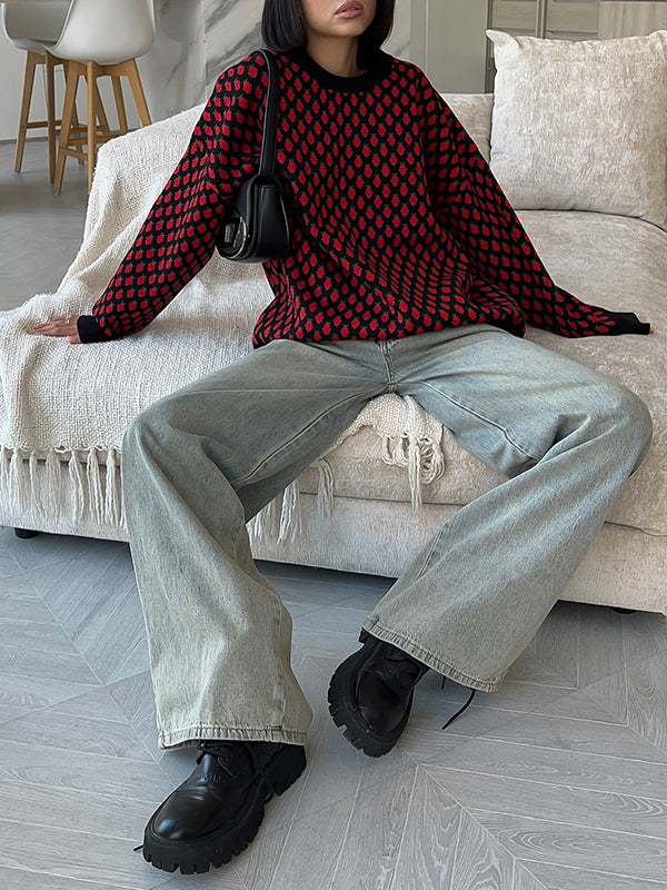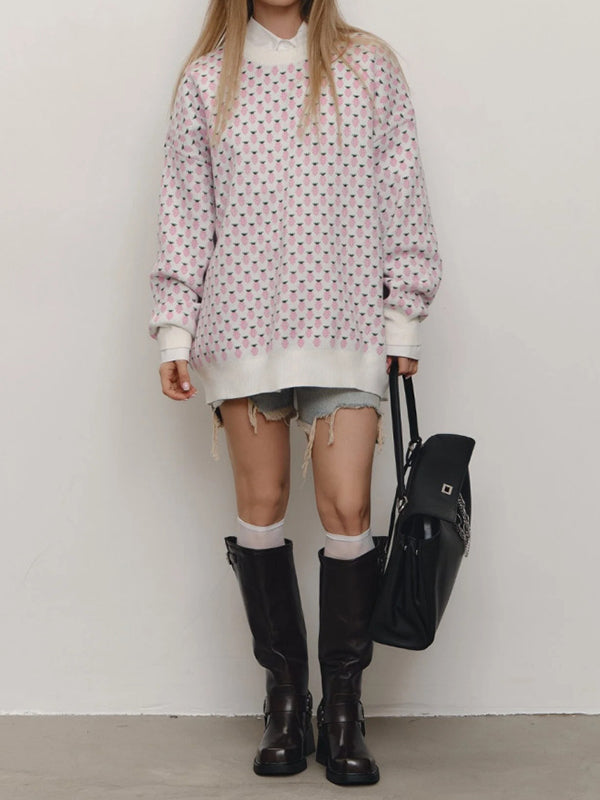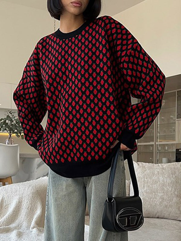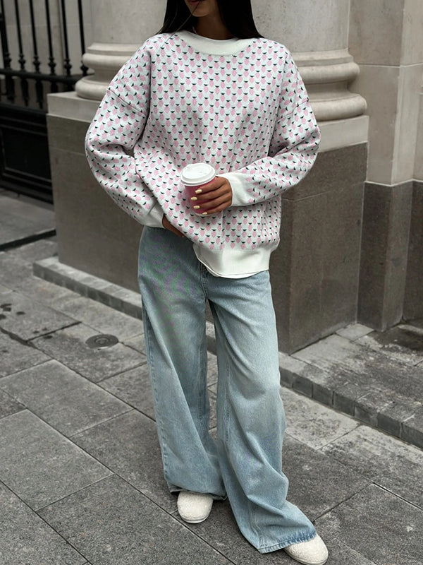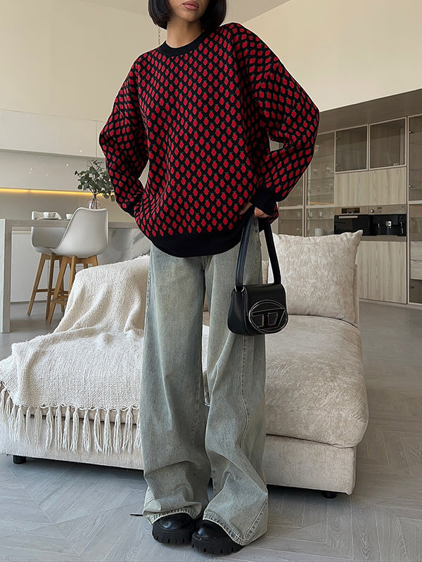Pleated Split-Joint Long Sleeves Loose Round-Neck Sweater Tops