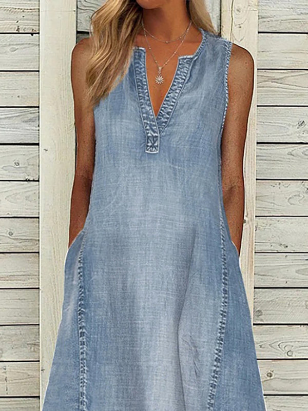 Pockets Loose Sleeveless V-Neck Denim Midi Dresses