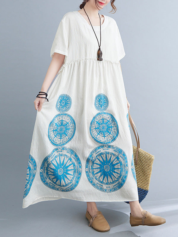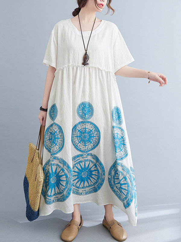 Ramie Cotton Round-Neck Ethnic Printed Loose Dress