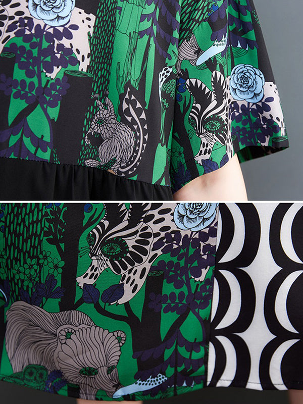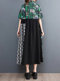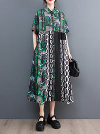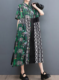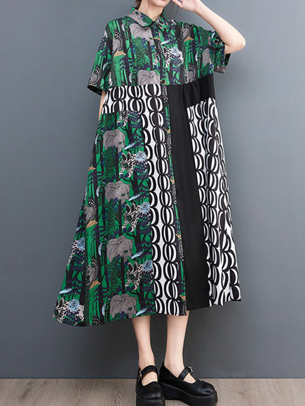Short Sleeves Loose Printed Split-Joint Lapel Midi Dresses Shirt Dress
