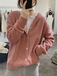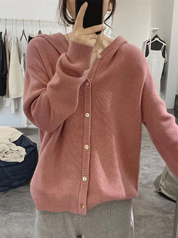Simple Loose Long Sleeves Buttoned Solid Color Hooded Sweater Cardigan Coats