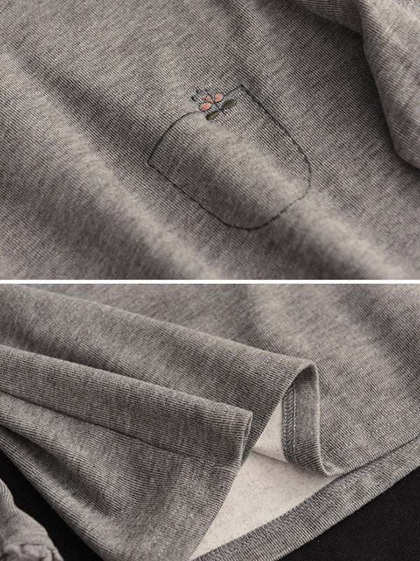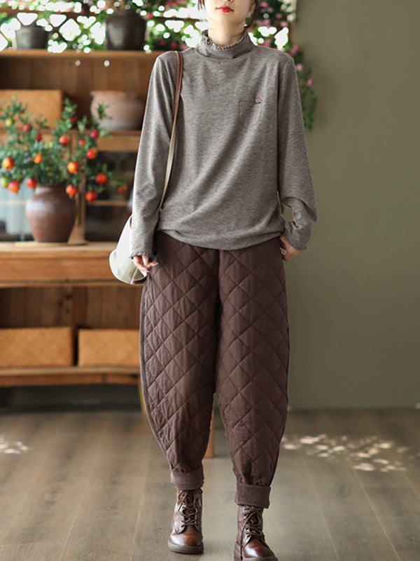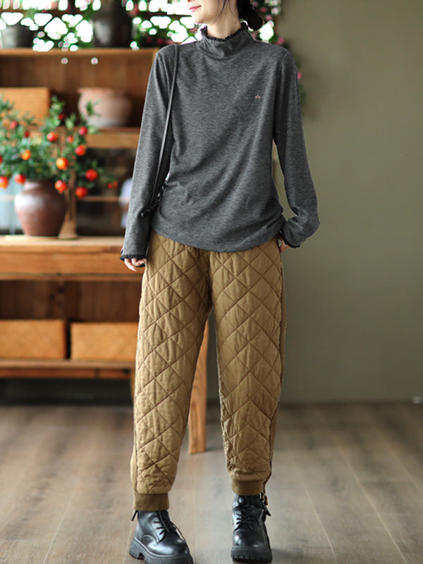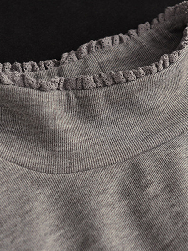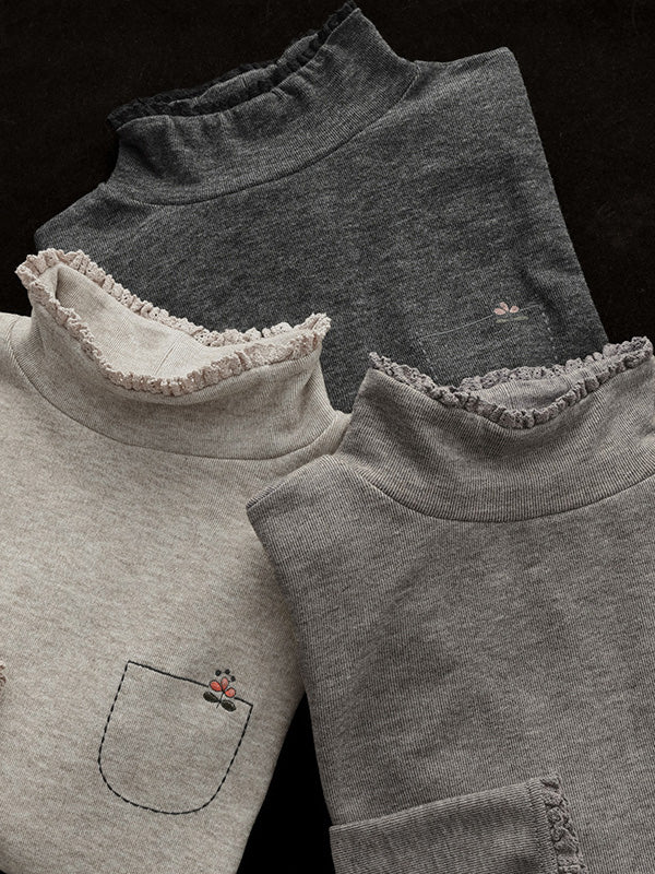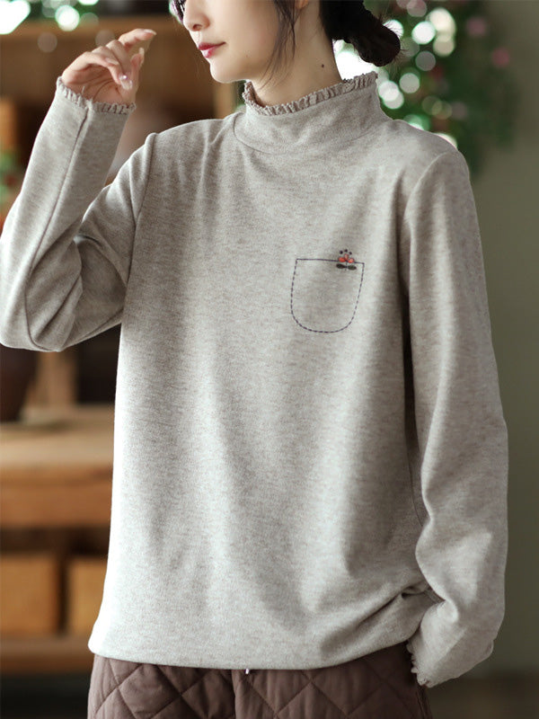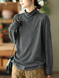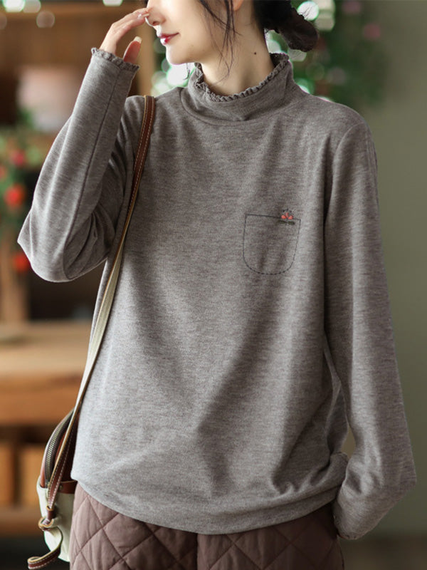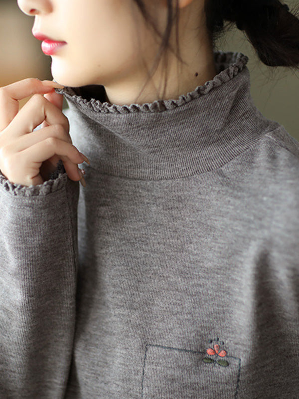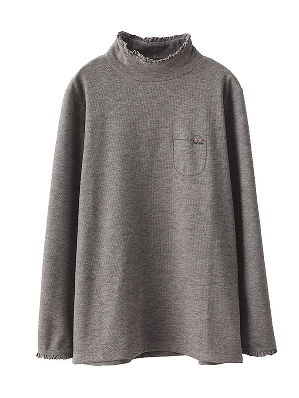Simple Loose Long Sleeves Embroidered Falbala Solid Color High-Neck T-Shirts Tops