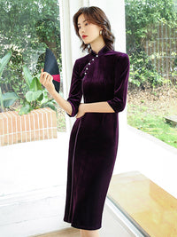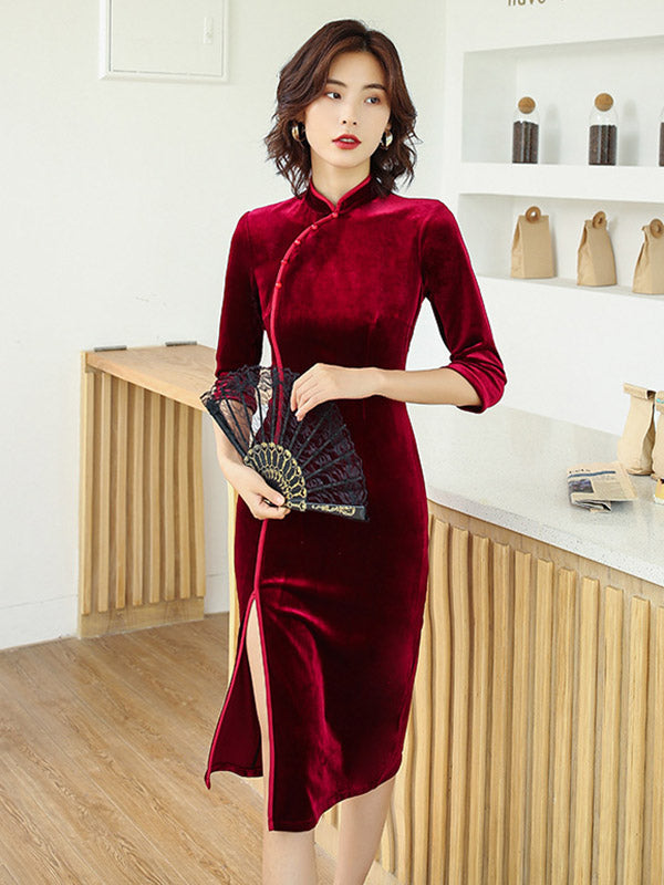 Solid Color Velvet Banquet Split-Side Long Cheongsams