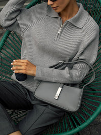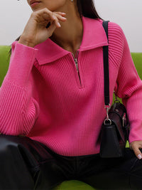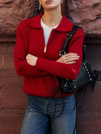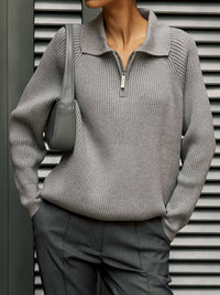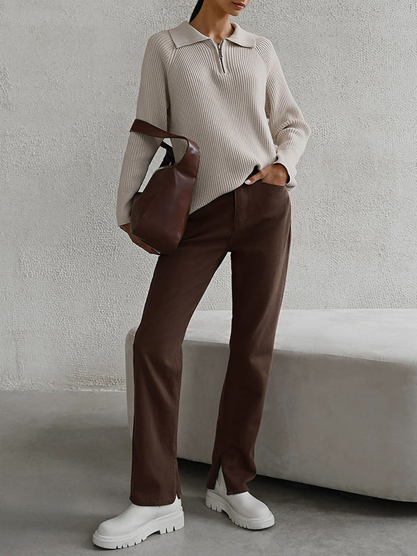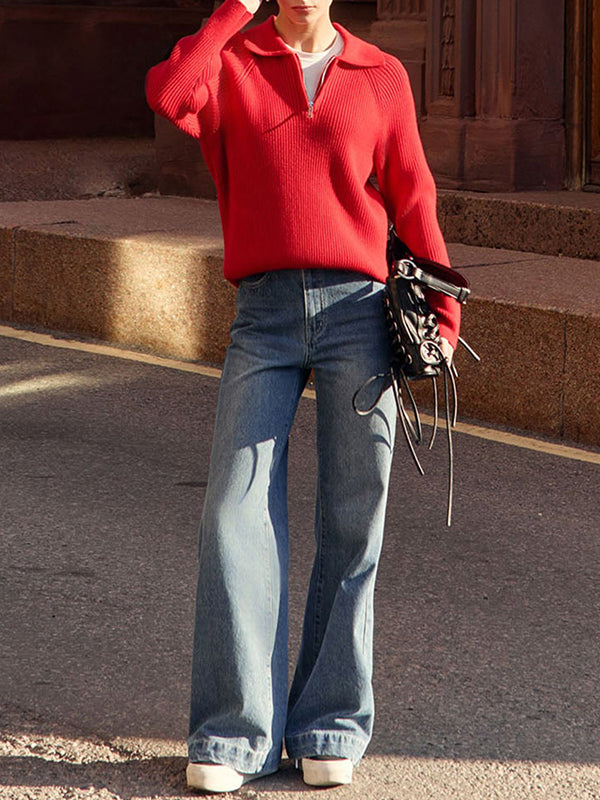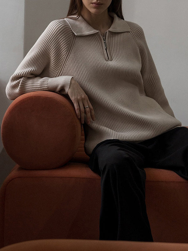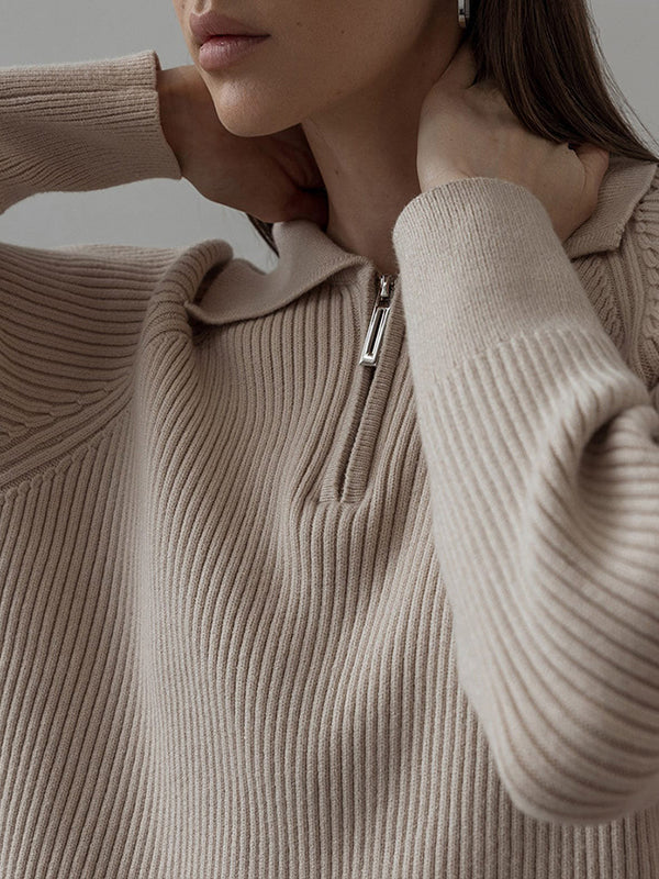 Solid Color Zipper Long Sleeves Loose Lapel Sweater Tops Pullovers