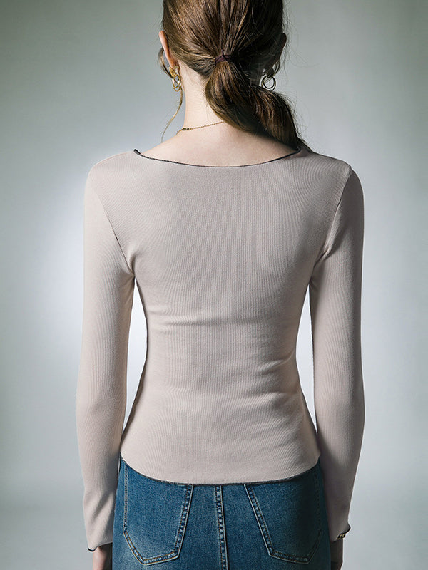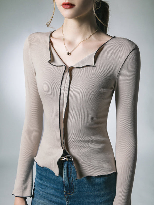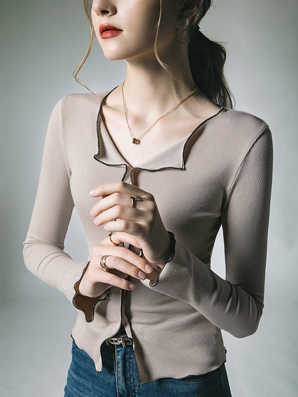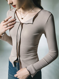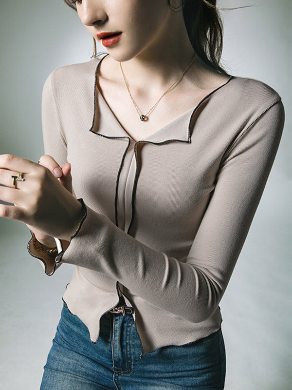 Split-Front Long Sleeves Skinny Lapel T-Shirts Tops