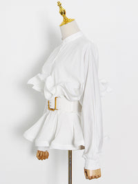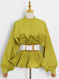 Stylish Loose Long Sleeves Buttoned Falbala Belted Solid Color Stand Collar Blouses&Shirts Tops