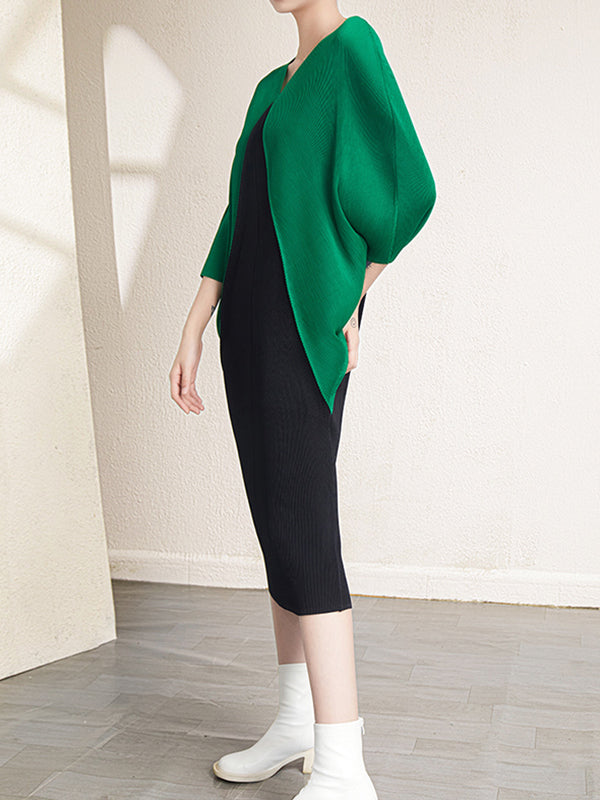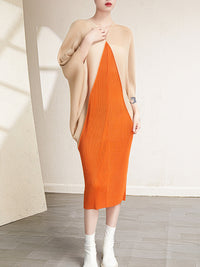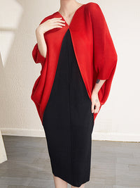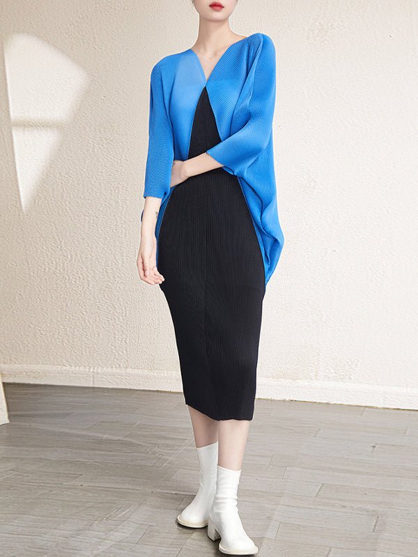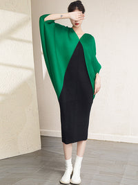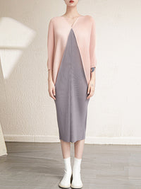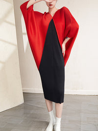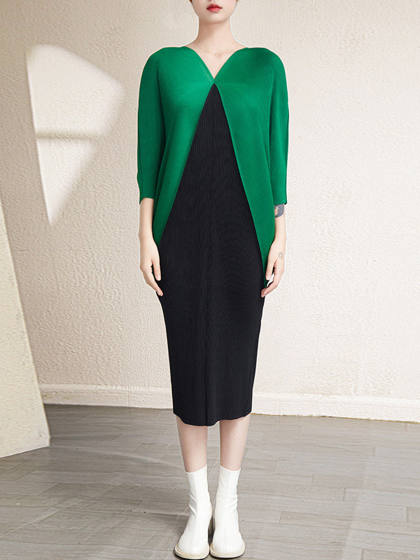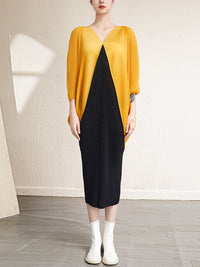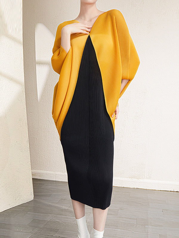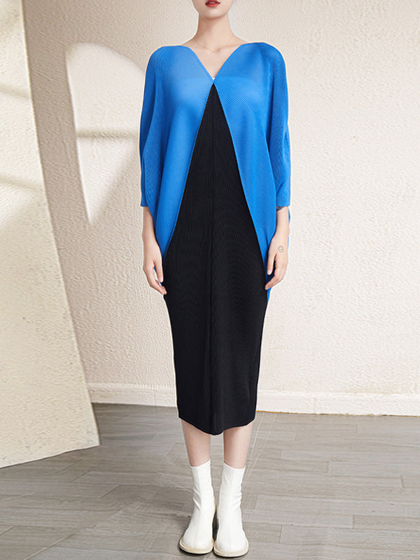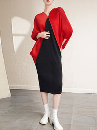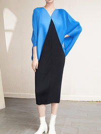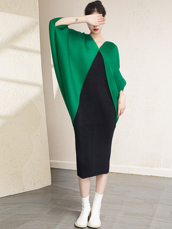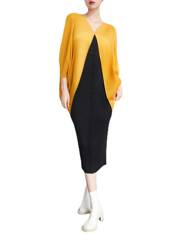 Urban Batwing Sleeves Contrast Color Pleated V-Neck Midi Dresses