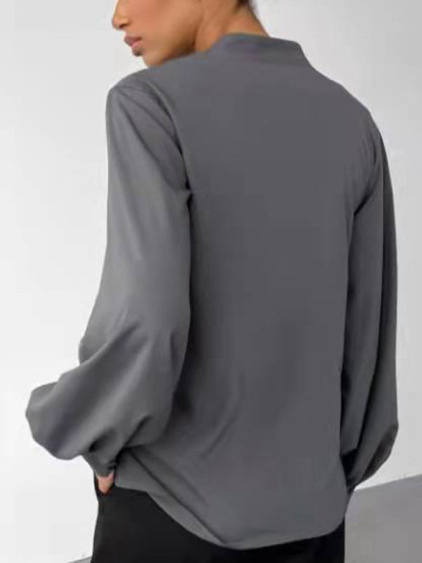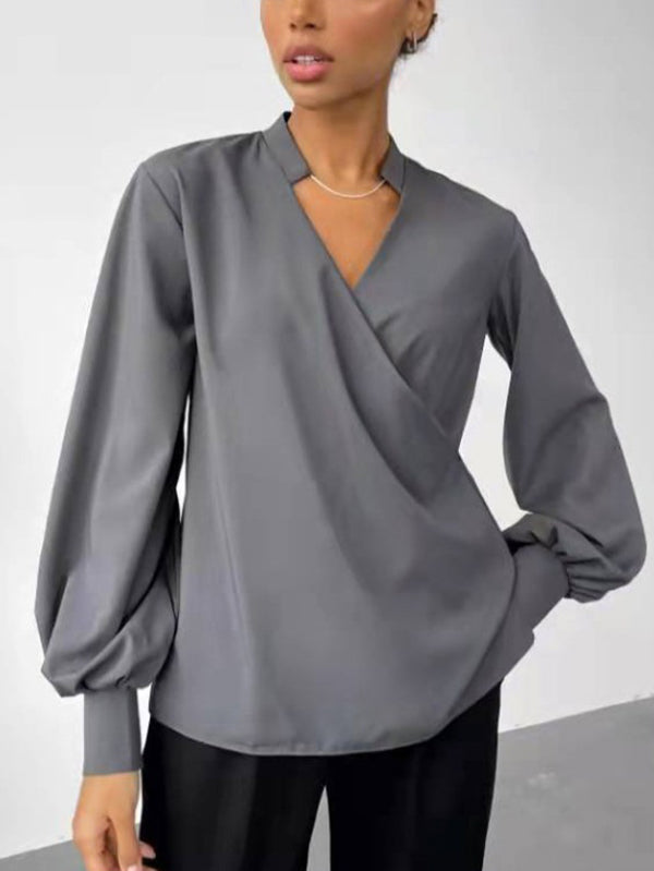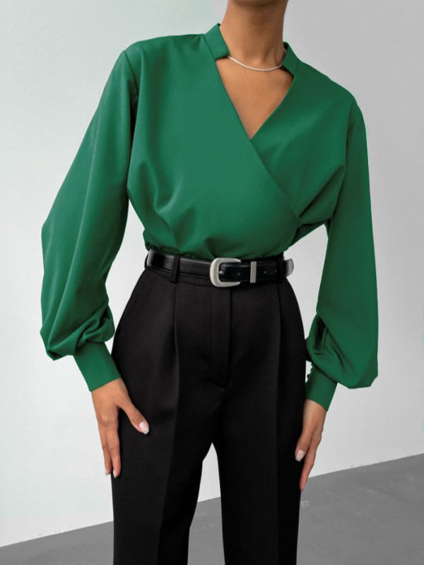 Urban Solid Color Puff Sleeve V-Neck Blouse Top