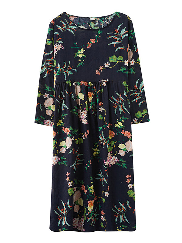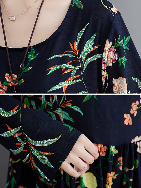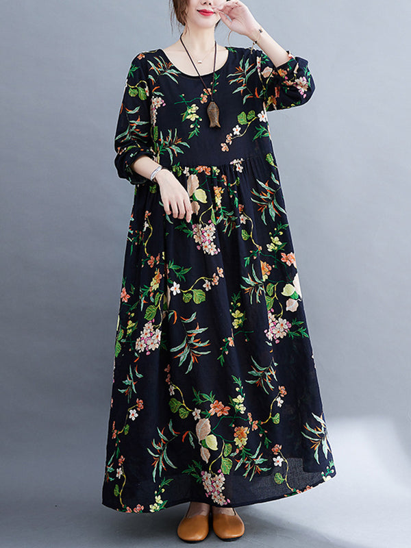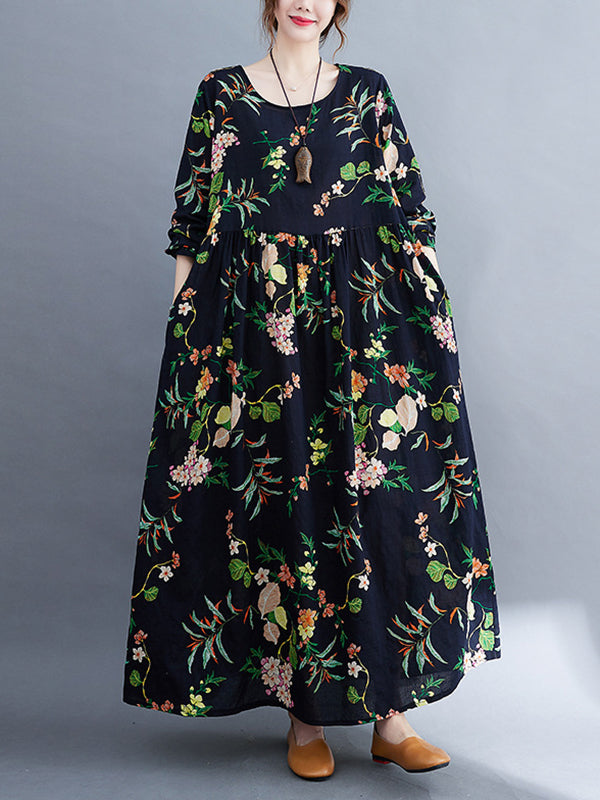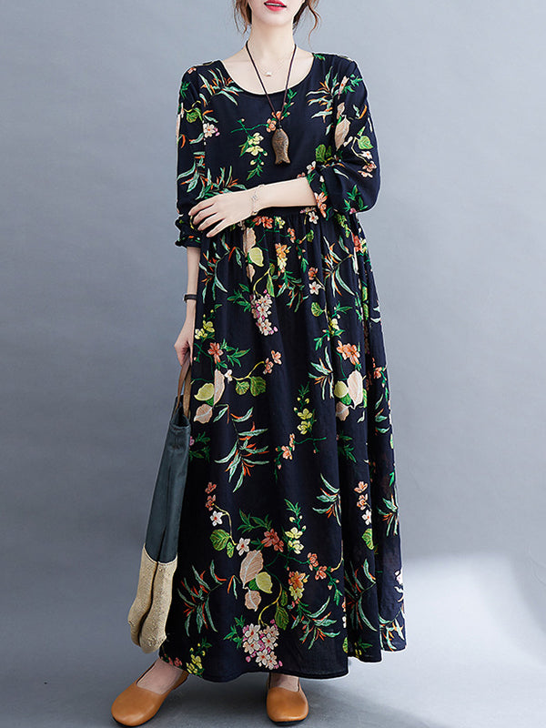 Vacation Long Sleeves Loose Floral Printed Round-Neck Maxi Dresses