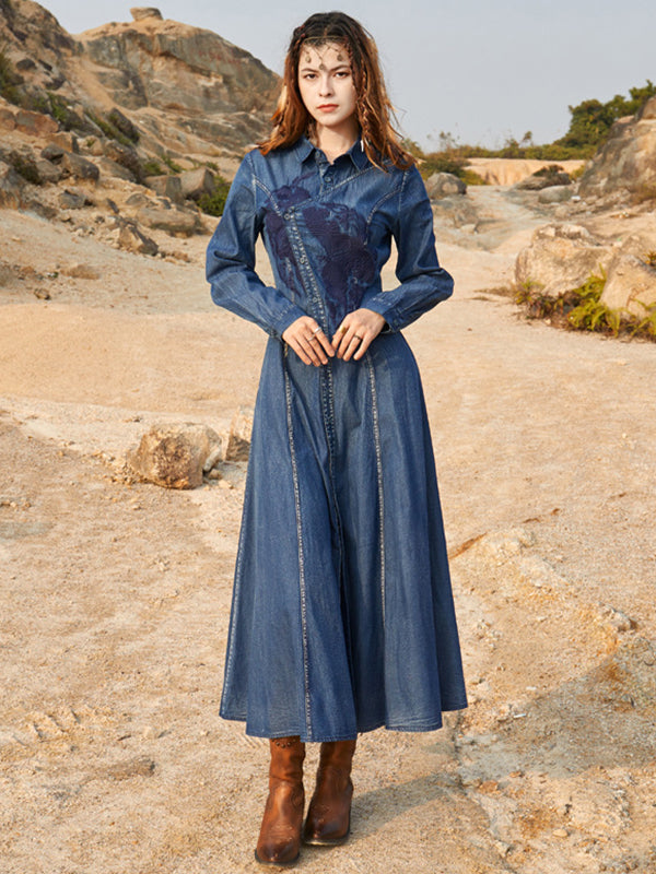 Vintage Bohemia Embroidered A-Line Dress Denim Midi Dress