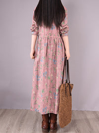 Vintage Floral Printed Ramie Cotton Loose Midi Dress