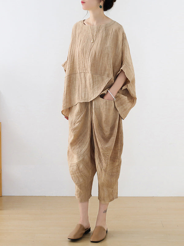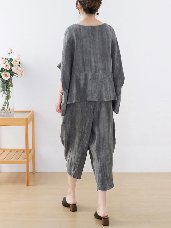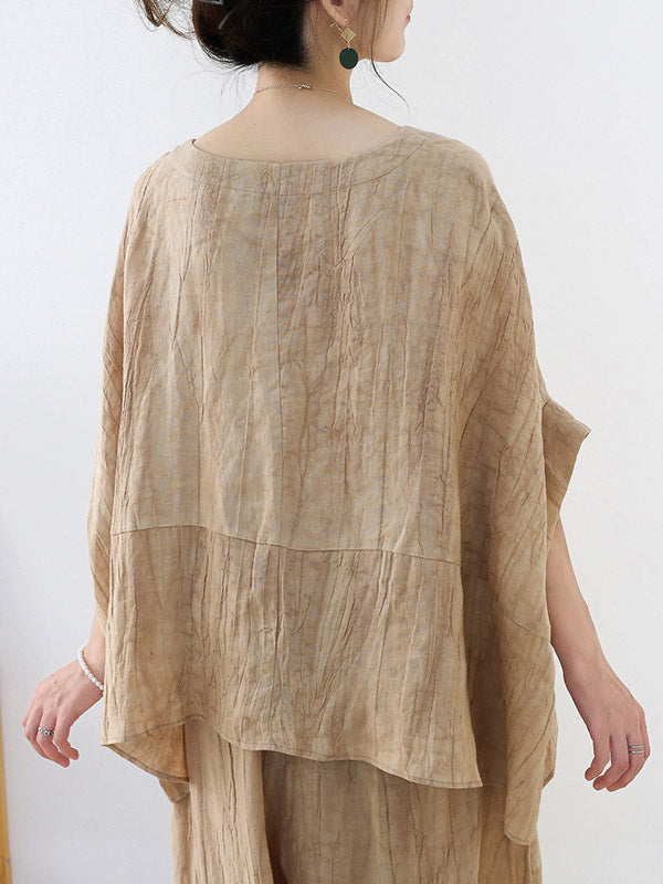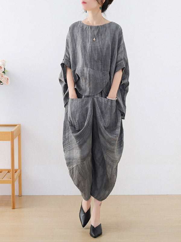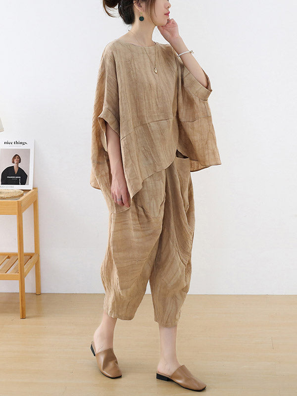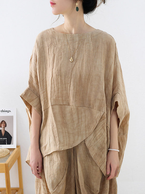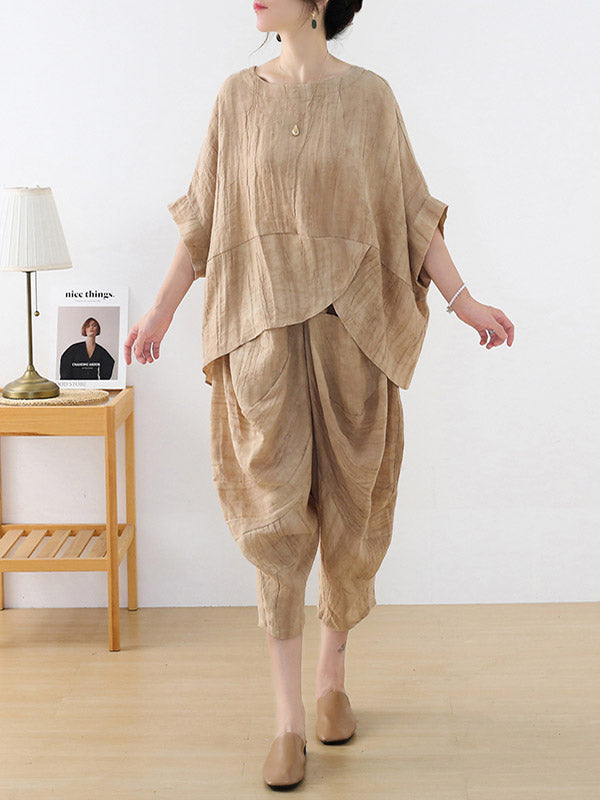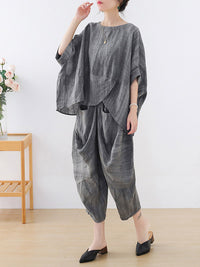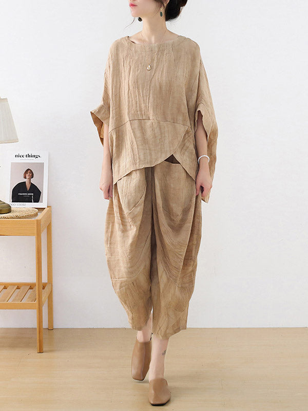 Vintage Linen Loose Split-Joint Round-Neck Batwing Sleeves T-Shirt+Elasticity Wide Leg Pants 2 Pieces Set