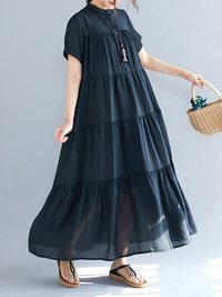 Vintage Loose Split-Joint Pleated Short Sleeves Round-Neck Midi Dress
