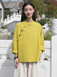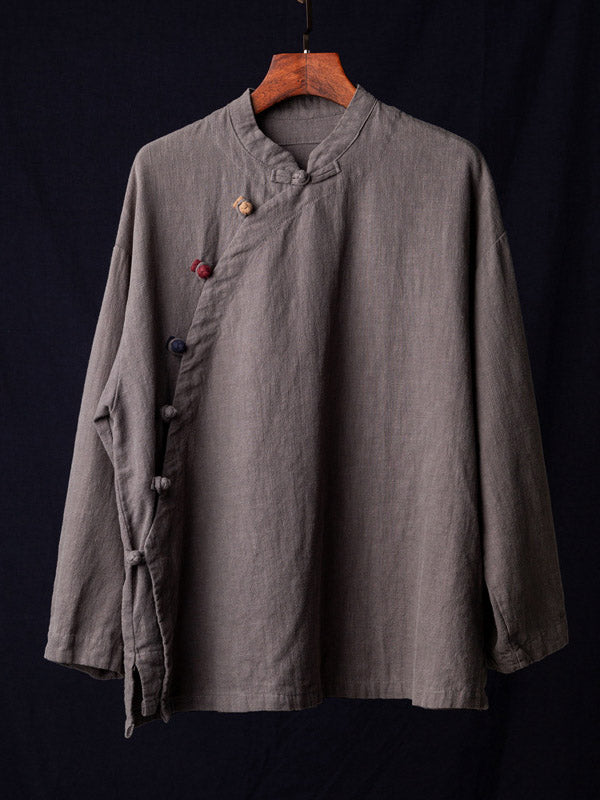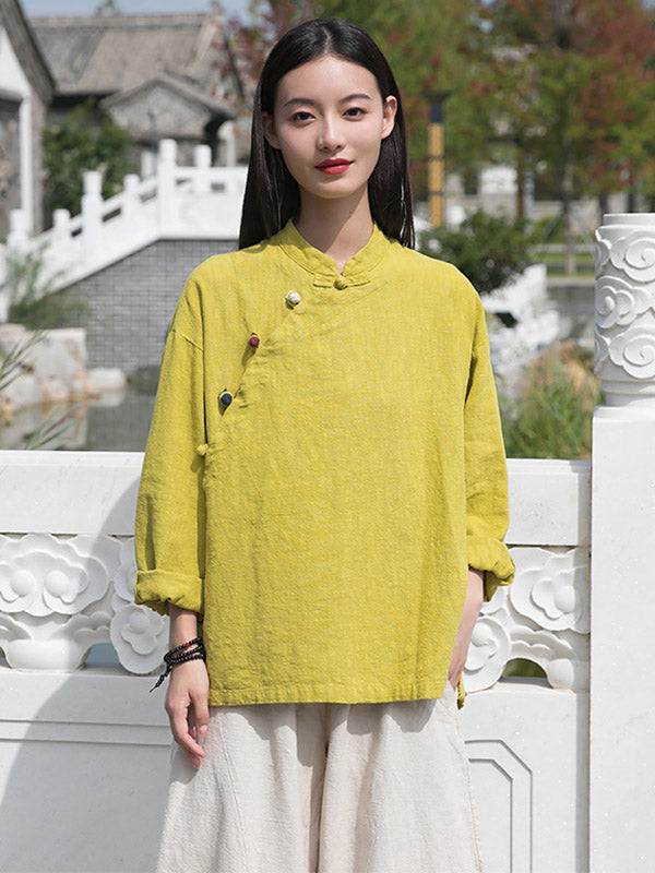 Vintage Ramie Cotton Stand Collar Loose Long Sleeve Shirt