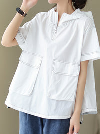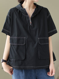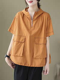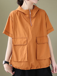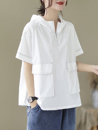 Zipper Loose Short Sleeves Hooded T-Shirts Tops